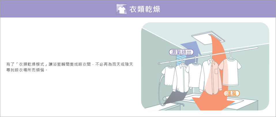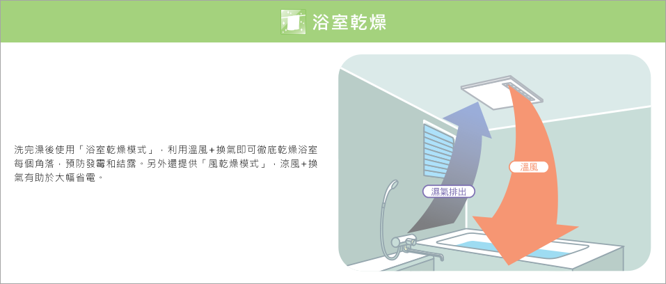 1.乾燥功能:具備衣物與浴室的雙效乾燥模式,可藉由是否採取加熱方式切換,進行速乾與節電的效果達到省電效果。